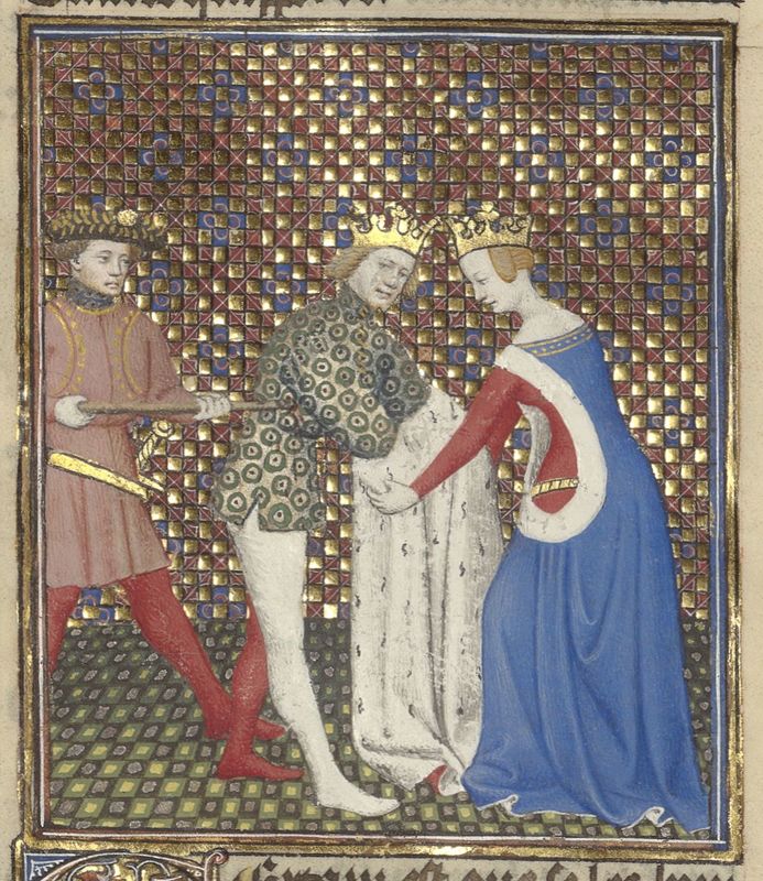 Parigi, Bibliothèque de l'Arsenal, 5193, f. 37v. Egisto uccide Agamennone a tradimento mentre Clitennestra lo aiuta a togliersi il mantello.