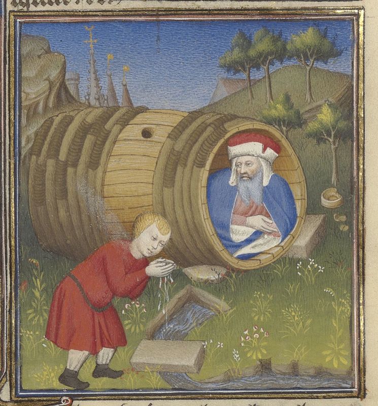 Parigi, Bibliothèque de l'Arsenal, 5193, f. 40r. Diogene dall'interno della sua botte osserva un bambino attingere acqua da un ruscello con le mani.