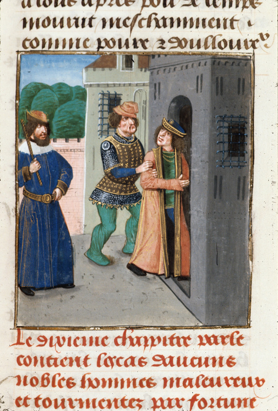 Londra, British Library, Royal 14 E V, f. 510r. Re Giovanni di Francia viene condotto in prigione, dove un uomo lo accoglie con rispetto.