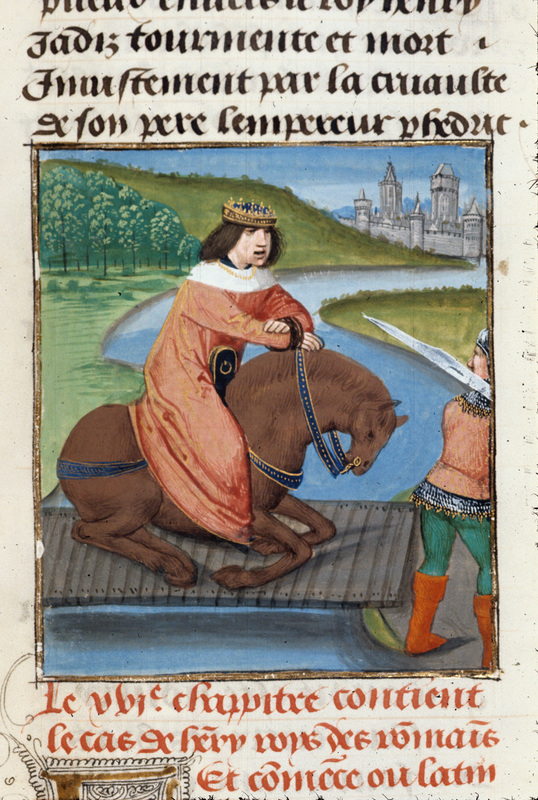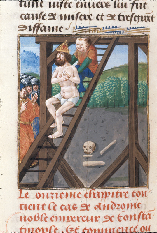 Londra, British Library, Royal 14 E V, f. 477v. L'imperatore Tito Andronico viene trascinato dal boia sul patibolo.