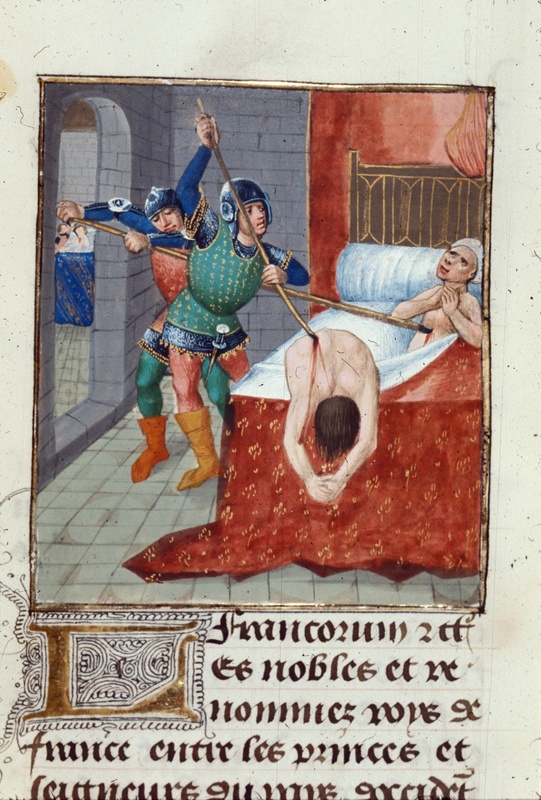 Londra, British Library, Royal 14 E V, f. 488r. Due soldati siciliani uccidono una copia di francesi nel loro letto durante la rivolta dei Vespri siciliani.