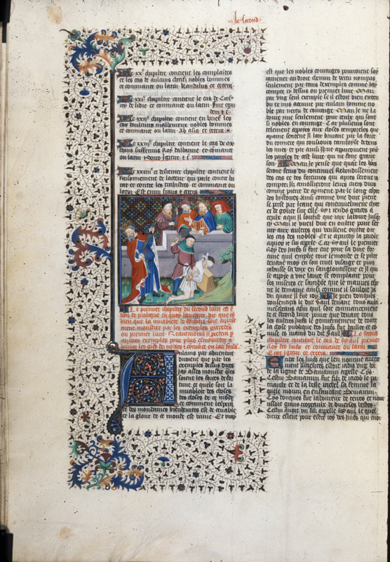 Londra, British Library, Royal 18 D VII, f. 79v. Marco Manlio Capitolino viene gettato dalla rupe Tarpea (raffigurata come una torre); alcuni uomini discutono tra loro.