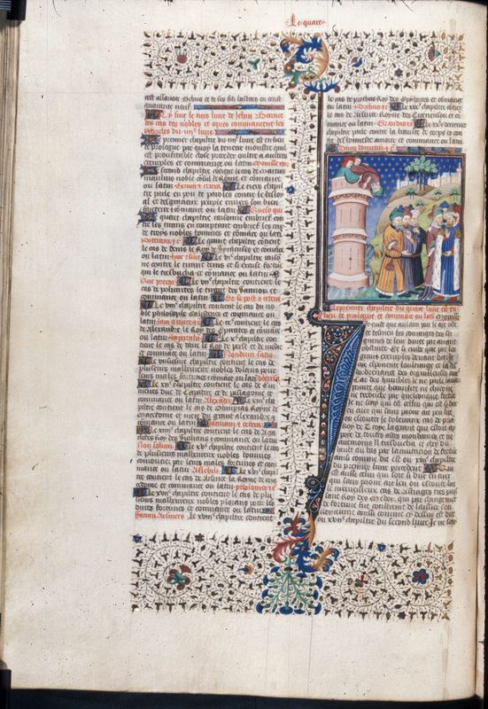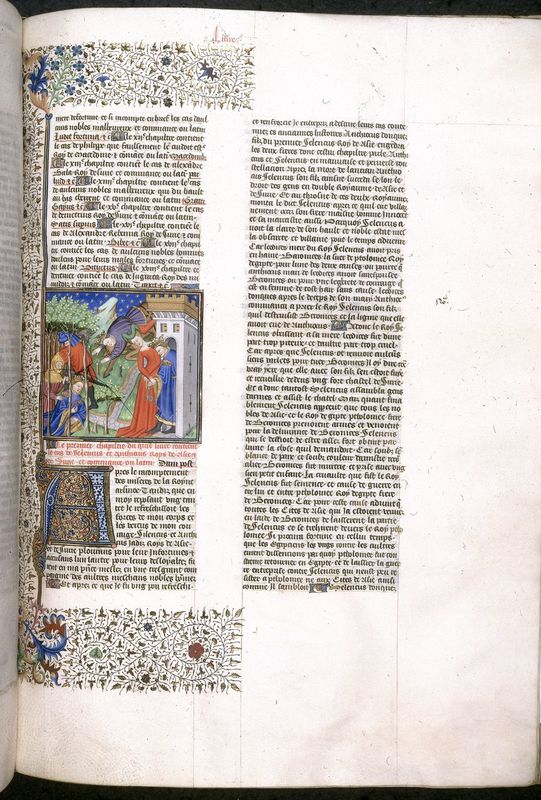 Londra, British Library, Royal 18 D VII, f. 106r. Beronice consegna le chiavi della città a Seleuco in segno di resa; Antioco viene ucciso nel bosco dai banditi; Seleuco cade da ca…