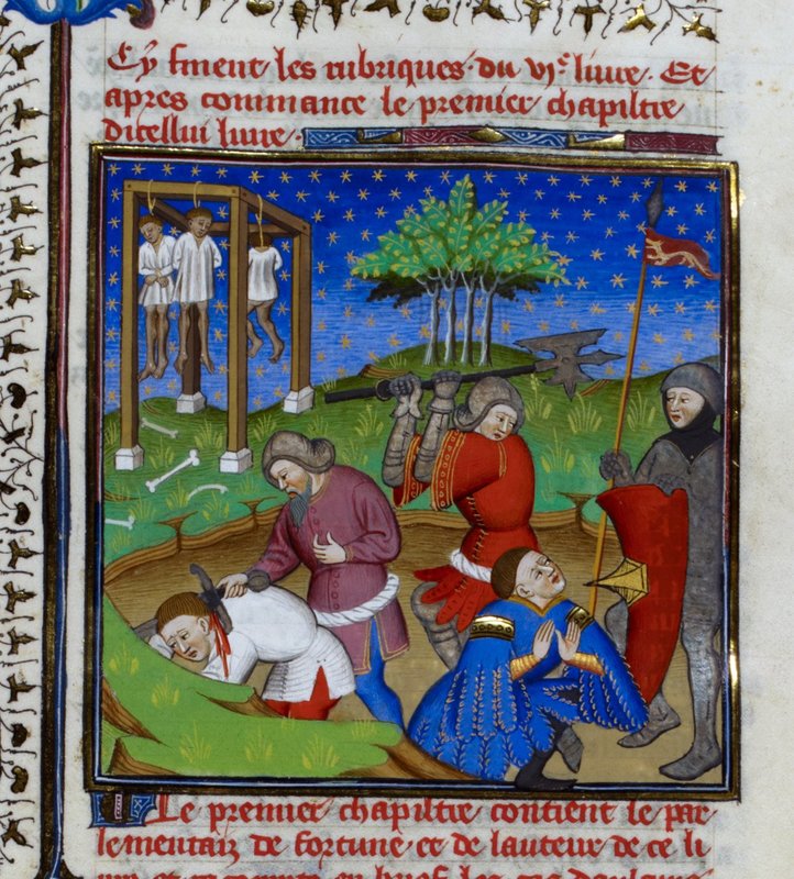 Londra, British Library, Royal 18 D VII, f. 129r. Alcuni uomini vengono giustiziati: tre uomini pendono da una forca mentre due vengono decapitati in una fossa.