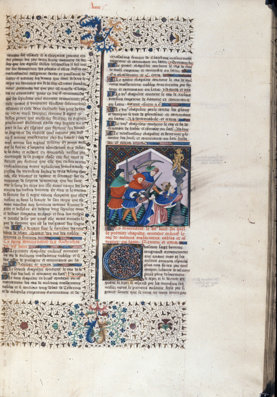 Londra, British Library, Royal 18 D VII, f. 155r. Marco Antonio Minore viene assassinato mentre tenta di ripararsi dietro una statua di Giulio Cesare.