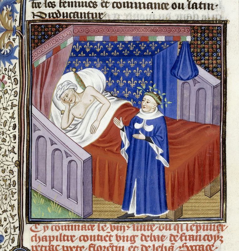 Londra, British Library, Royal 18 D VII, f. 175r. Francesco Petrarca, con una corona d'alloro sulla testa, appare in sogno a Giovanni Boccaccio.