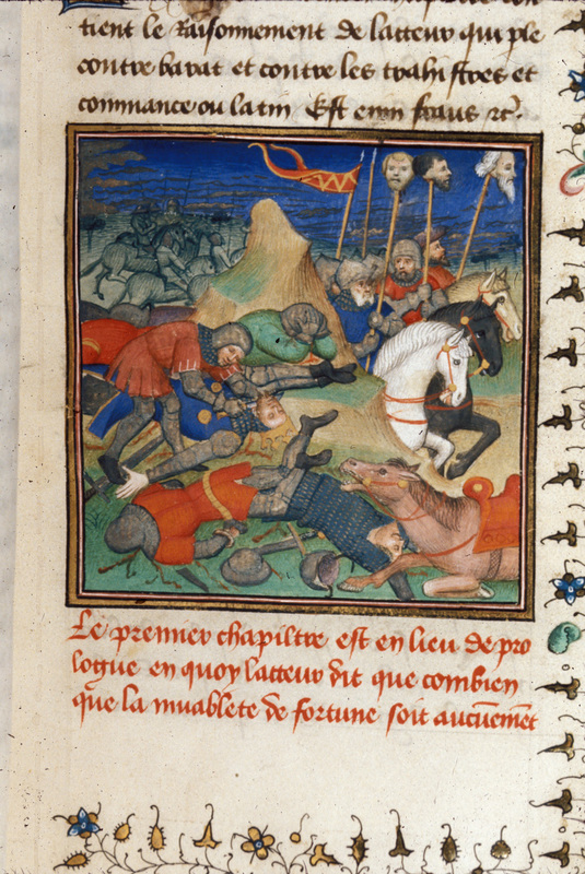 Londra, British Library, Royal 20 C IV, f. 43r. Re Saul viene sconfitto nella battaglia sul Monte Gelboe e viene decapitato; i Filistei a cavallo recano le teste dei figli di Saul …