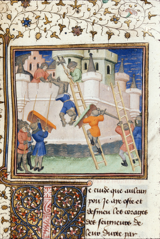 Londra, British Library, Royal 20 C IV, f. 119r. I Galli assediano le mura di Roma; dalle stesse mura Manlio Capitolino viene gettato nel fossato (testo mal compreso: rappresenta M…