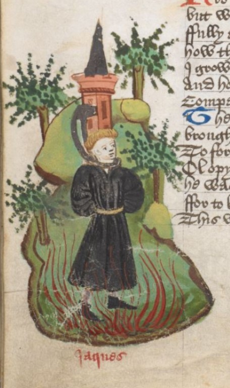 Londra, British Library, Harley 1766, f. 248v. Il templare Jacques de Molay è condannato al rogo.