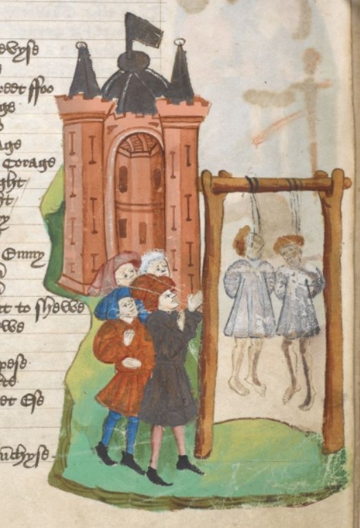 Londra, British Library, Harley 1766, f. 255r. Il popolo assiste all'impiccagione di Guglielmo d'Assisi e di suo figlio.