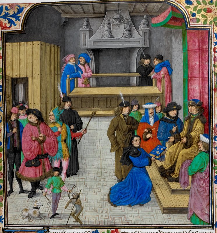 Londra, British Library, Royal 14 E V, f. 5r. Laurent de Premierfait si presenta a corte per offrire il libro al duca Jean di Berry.