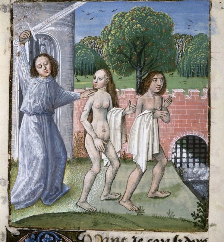 Londra, British Library, Royal 14 E V, f. 13v. Adamo ed Eva vengono cacciati dal Paradiso Terrestre da un angelo con la spada sollevata.