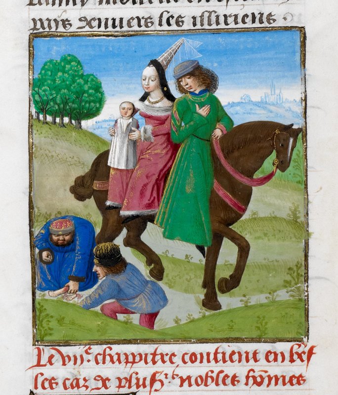 Londra, British Library, Royal 14 E V, f. 24v. Giasone e Medea fuggono a cavallo recando con sé il corpo smembrato di Apsirto (Egialeo), mentre Eete interrompe l'inseguimento per r…