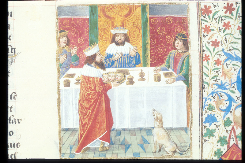 Londra, British Library, Royal 14 E V, f. 30r. Durante un banchetto Atreo serve a Tieste le teste dei suoi figli su un piatto.