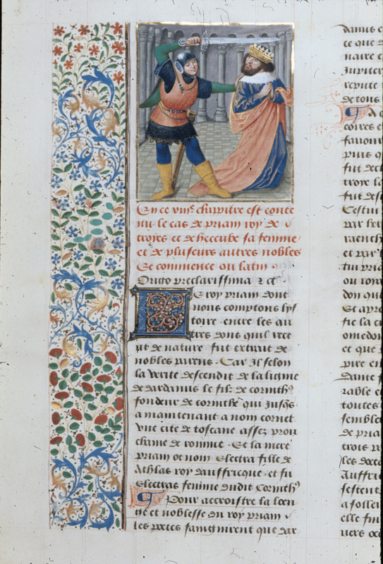 Londra, British Library, Royal 14 E V, f. 45v. Neottolemo (Pirro) uccide il re Priamo.