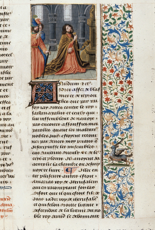 Londra, British Library, Royal 14 E V, f. 74r. La regina Atalia viene trascinata per i capelli fuori le mura di Gerusalemme.