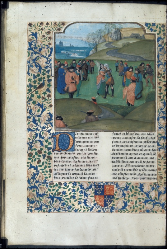 Londra, British Library, Royal 14 E V, f. 113v. Un gruppo di uomini osserva la Povertà, rappresentata come un vecchio in abiti laceri, lottare contro la Fortuna, raffigurata come u…