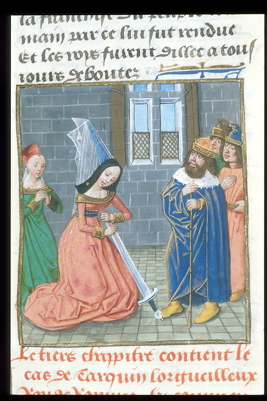 Londra, British Library, Royal 14 E V, f. 121v. Lucrezia compie il suicidio dinanzi ai suoi familiari.