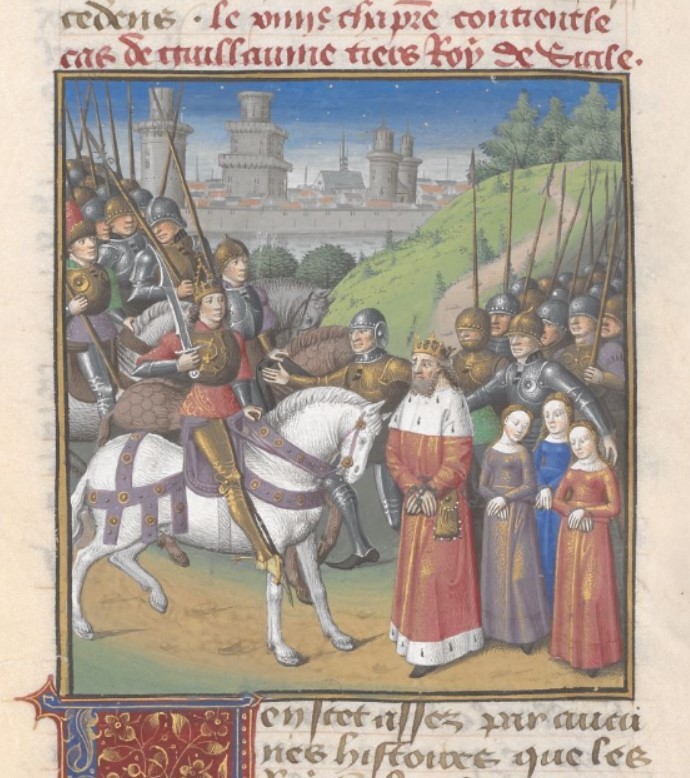Londra, British Library, Add. 35321, f. 303r. Enrico VI, giunto a cavallo a capo delle sue truppe, incontra i prigionieri Guglielmo di Sicilia e le sue tre sorelle.