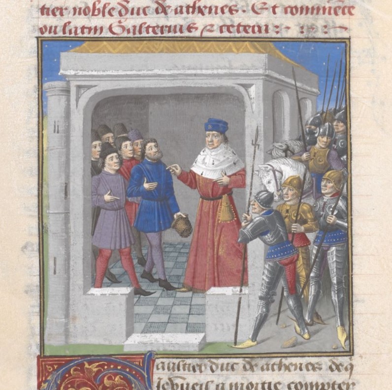 Londra, British Library, Add. 35321, f. 314v. Gli abitanti di Firenze invitano Gualtieri di Brienne ad assumere il governo della città; alcuni soldati attendono all'esterno del pal…