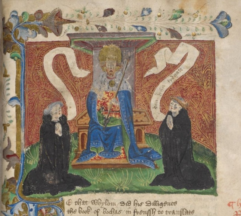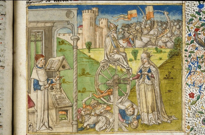 Londra, British Library, Harley 621, f. 217r. L'autore Giovanni Boccaccio discute con la Fortuna, la quale gira la ruota che determina la sorte di re e uomini comuni; due eserciti …