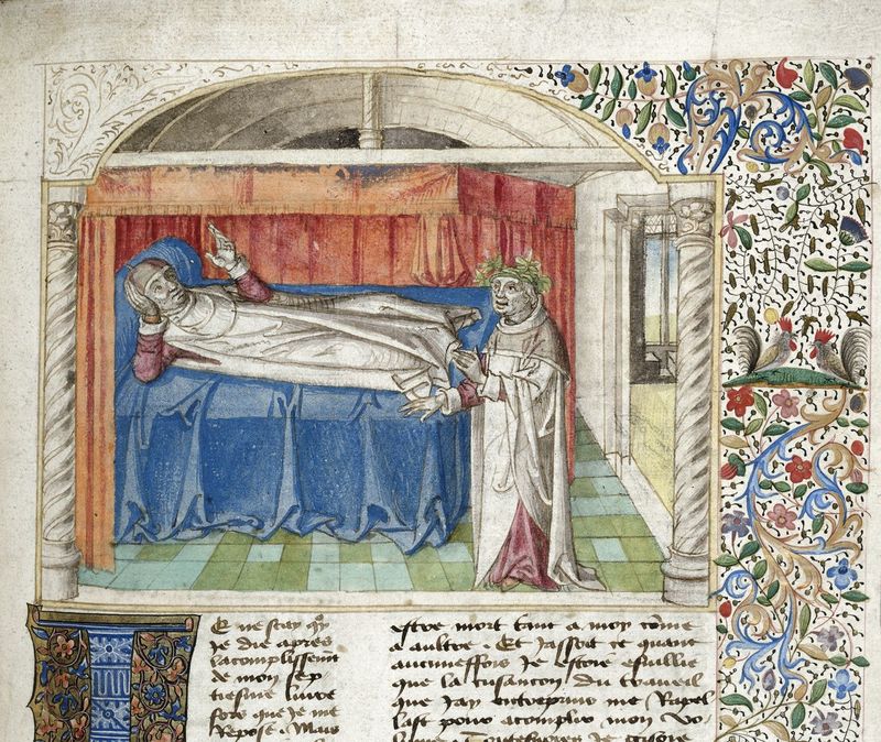 Londra, British Library, Harley 621, f. 315r. Francesco Petrarca appare in sogno a Giovanni Boccaccio.