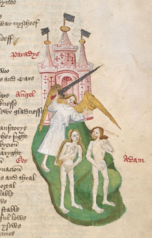 Londra, British Library, Harley 1766, f. 13r. Adamo ed Eva vengono cacciati dal Paradiso Terrestre da un angelo con la spada sguainata.