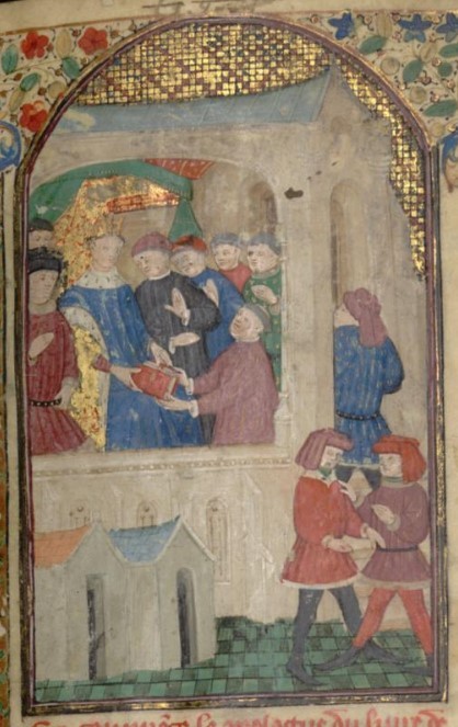 Parigi, Bibliothèque interuniversitaire Sainte-Geneviève, 1128, f. 10v. Giovanni Boccaccio conversa con tre personaggi colpiti dalla sfortuna; alcuni spettatori osservano la scena.