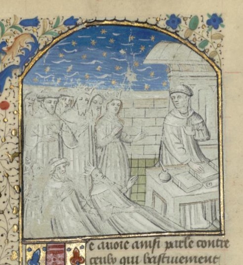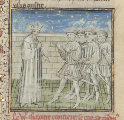 Parigi, Bibliothèque interuniversitaire Sainte-Geneviève, 1128, f. 36r. Giovanni Boccaccio incontra quattro re coperti di ferite.