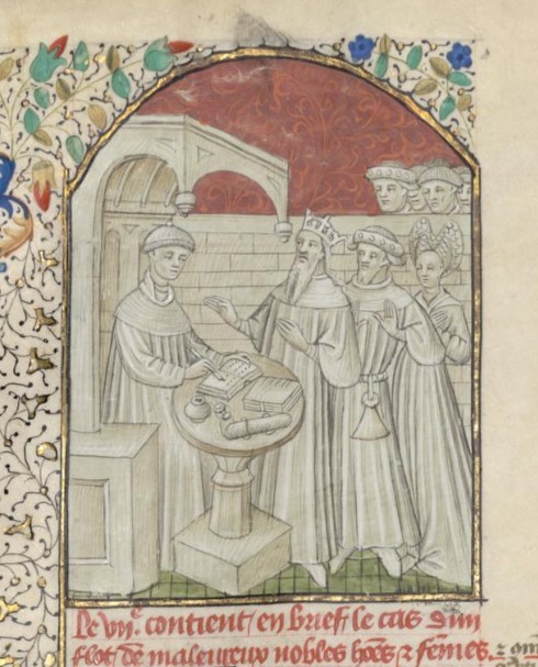 Parigi, Bibliothèque interuniversitaire Sainte-Geneviève, 1129, f. 1r. Nella sala del trono Laurent de Premierfait presenta il libro al re Carlo VI, circondato dai suoi consiglieri…