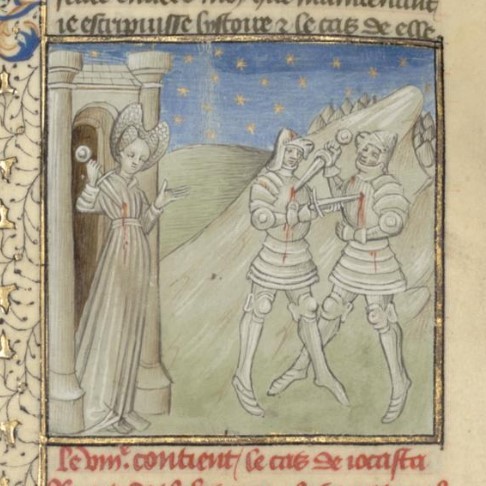 Parigi, Bibliothèque interuniversitaire Sainte-Geneviève, 1128, f. 12r. La regina Giocasta si trafigge con un pugnale; i fratelli Eteocle e Polinice si uccidono in battaglia.