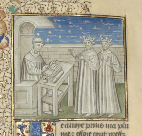 Parigi, Bibliothèque interuniversitaire Sainte-Geneviève, 1128, f. 14r. Atreo e Tieste compaiono dinanzi a Giovanni Boccaccio.