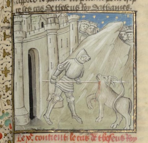 Parigi, Bibliothèque interuniversitaire Sainte-Geneviève, 1128, f. 16r. Teseo uccide il Toro di Maratona alle porte di Atene, osservato da alcuni spettatori.