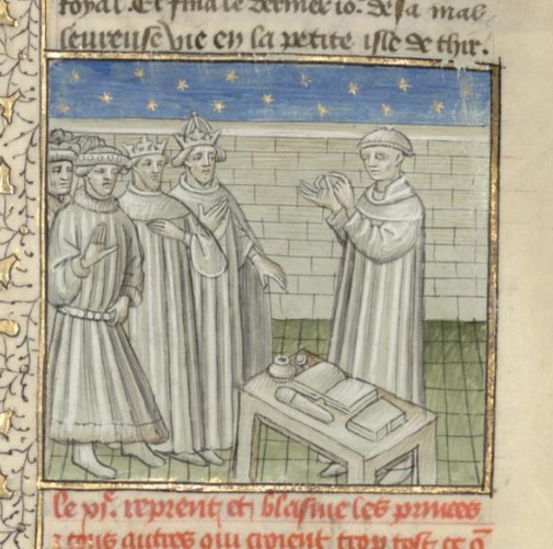 Parigi, Bibliothèque interuniversitaire Sainte-Geneviève, 1128, f. 40v. Giovanni Boccaccio invita un gruppo di sovrani all'obbedienza verso Dio.