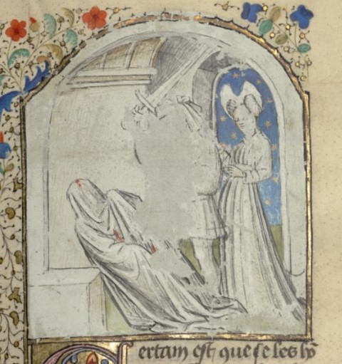 Parigi, Bibliothèque interuniversitaire Sainte-Geneviève, 1128, f. 33r. Giovanni Boccaccio incontra alcune dame nel suo studio.