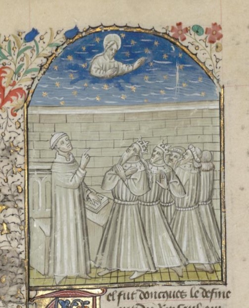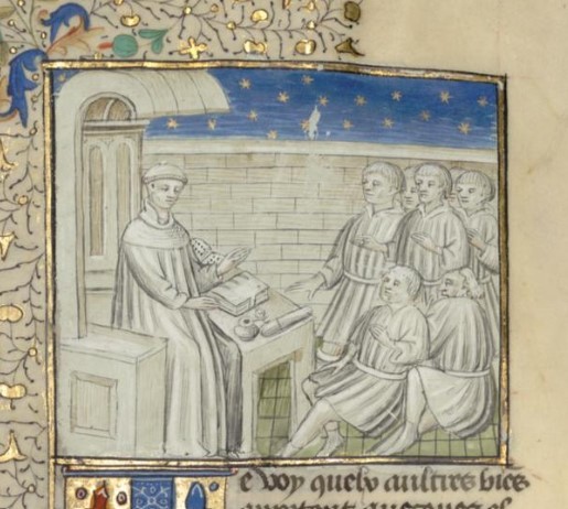 Parigi, Bibliothèque interuniversitaire Sainte-Geneviève, 1128, f. 6v. Giovanni Boccaccio si rivolge ad un gruppo di nobili.
