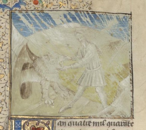 Parigi, Bibliothèque interuniversitaire Sainte-Geneviève, 1128, f. 31r. Sansone sconfigge il leone a mani nude.