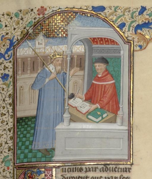 Parigi, Bibliothèque interuniversitaire Sainte-Geneviève, 1128, f. 38r. Re Saul, armato di lancia, compare dinanzi a Giovanni Boccaccio.