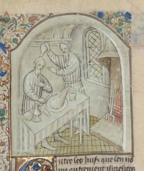 Parigi, Bibliothèque interuniversitaire Sainte-Geneviève, 1128, f. 38v. Samuele consacra Saul re ungendogli il capo con l'olio santo.