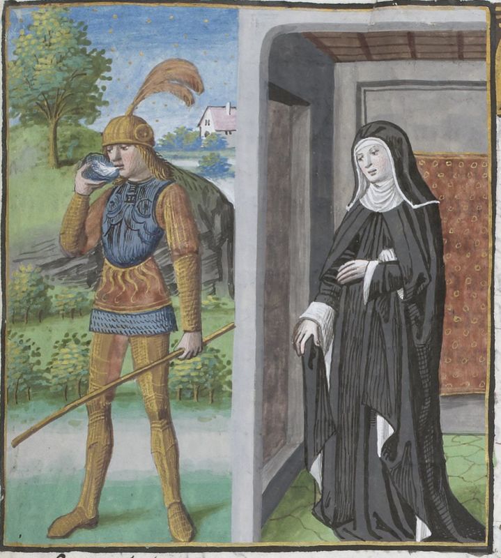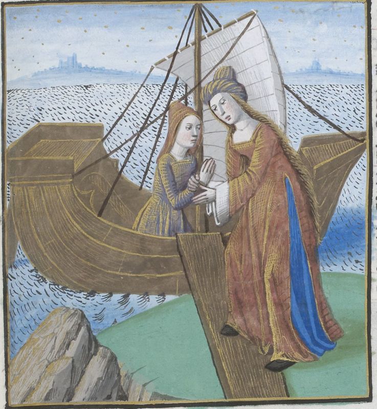 Parigi, Bibliothèque Nationale de France, Vélins 1223, f. o2v. Incunabolo miniato stampato a Parigi da Antoine Vérard il 26/04/1493. Sulpicia parte alla ricerca del marito.