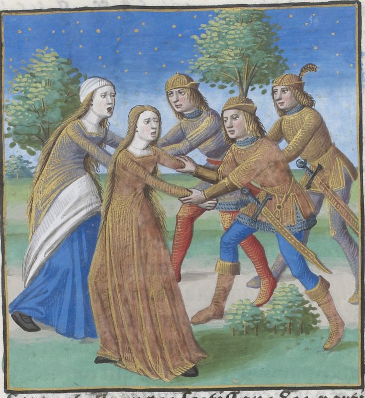 Parigi, Bibliothèque Nationale de France, Vélins 1223, f. n6v. Incunabolo miniato stampato a Parigi da Antoine Vérard il 26/04/1493. Le donne dei Cimbri vengono catturate dai solda…