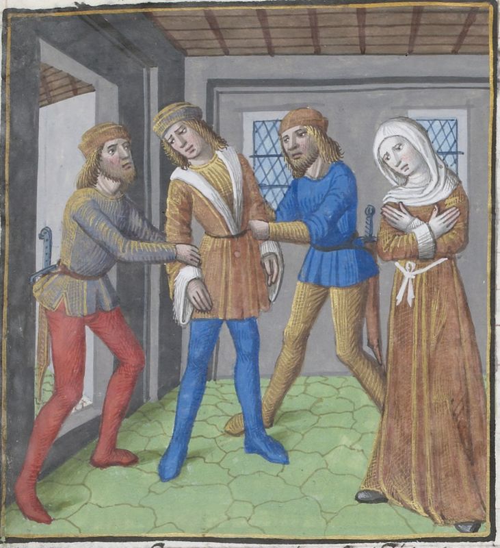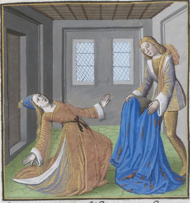 Maestro di Jacques de Besançon (1493), Giulia sviene alla vista delle vesti insanguinate del marito
