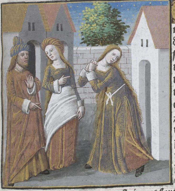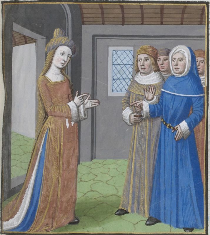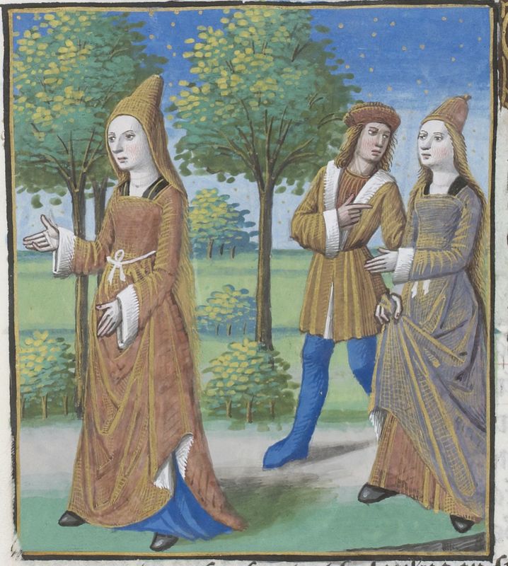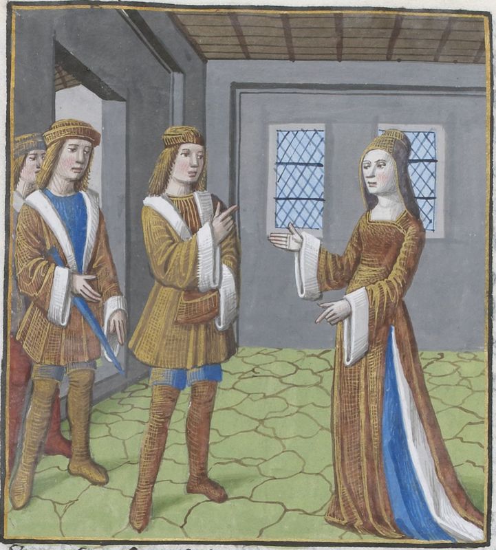 Parigi, Bibliothèque Nationale de France, Vélins 1223, f. r1v. Incunabolo miniato stampato a Parigi da Antoine Vérard il 26/04/1493. Faustina si rivolge ad alcuni ammiratori.