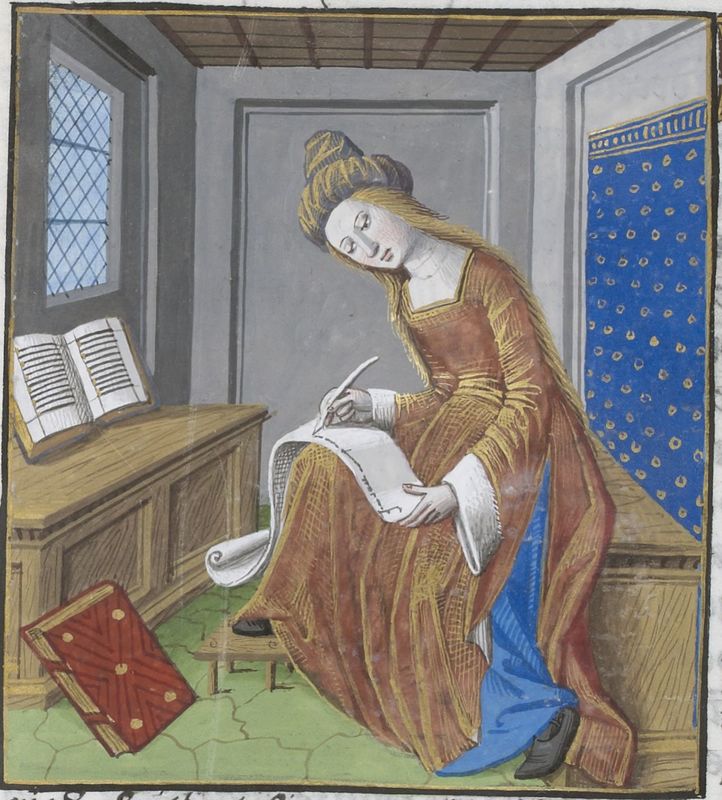 Parigi, Bibliothèque Nationale de France, Vélins 1223, f. o3v. Incunabolo miniato stampato a Parigi da Antoine Vérard il 26/04/1493. La poetessa Cornificia scrive nel suo studio.
