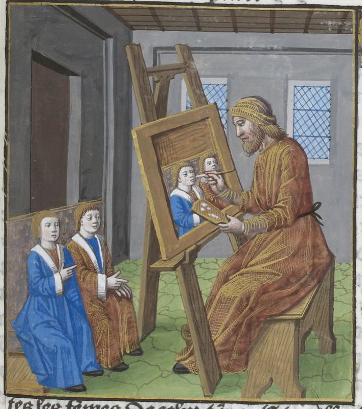 Parigi, Bibliothèque Nationale de France, Vélins 1223, f. o4r. Incunabolo miniato stampato a Parigi da Antoine Vérard il 26/04/1493. Un pittore esegue il ritratto dei due figli del…
