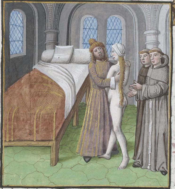 Parigi, Bibliothèque Nationale de France, Vélins 1223, f. p4v. Incunabolo miniato stampato a Parigi da Antoine Vérard il 26/04/1493. Il sacerdote Mondo corteggia Paolina dinanzi a …