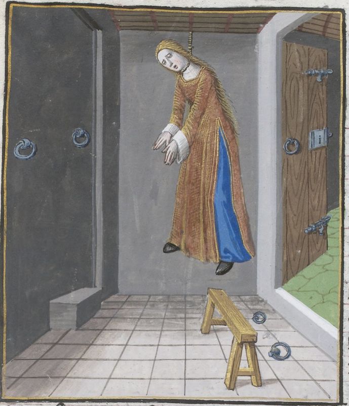 Parigi, Bibliothèque Nationale de France, Vélins 1223, f. q2v. Incunabolo miniato stampato a Parigi da Antoine Vérard il 26/04/1493. Epicari si impicca nella sua cella.