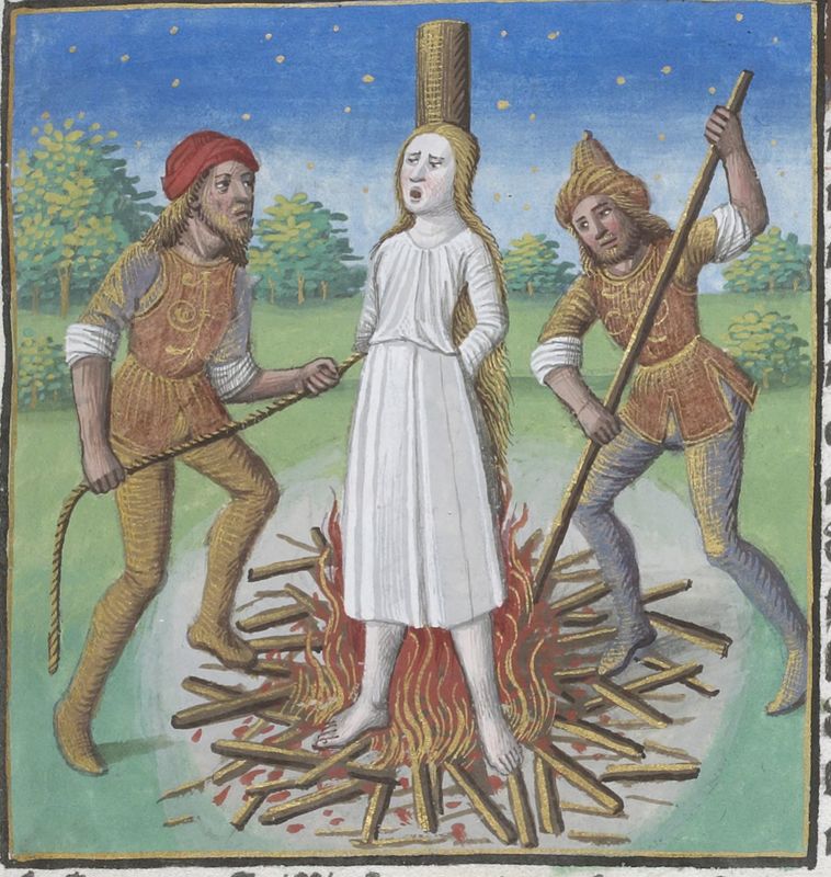 Parigi, Bibliothèque Nationale de France, Vélins 1223, f. q5r. Incunabolo miniato stampato a Parigi da Antoine Vérard il 26/04/1493. Poppea Sabina, moglie di Nerone, viene bruciata…
