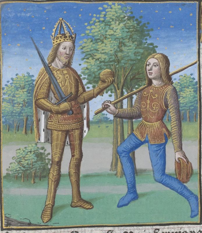 Parigi, Bibliothèque Nationale de France, Vélins 1223, f. r2r. Incunabolo miniato stampato a Parigi da Antoine Vérard il 26/04/1493. Vario, figlio di Semiaira, si inginocchia dinan…