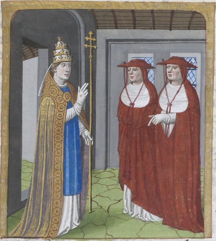 Parigi, Bibliothèque Nationale de France, Vélins 1223, f. r8r. Incunabolo miniato stampato a Parigi da Antoine Vérard il 26/04/1493. La papessa Giovanna si rivolge a due cardinali.